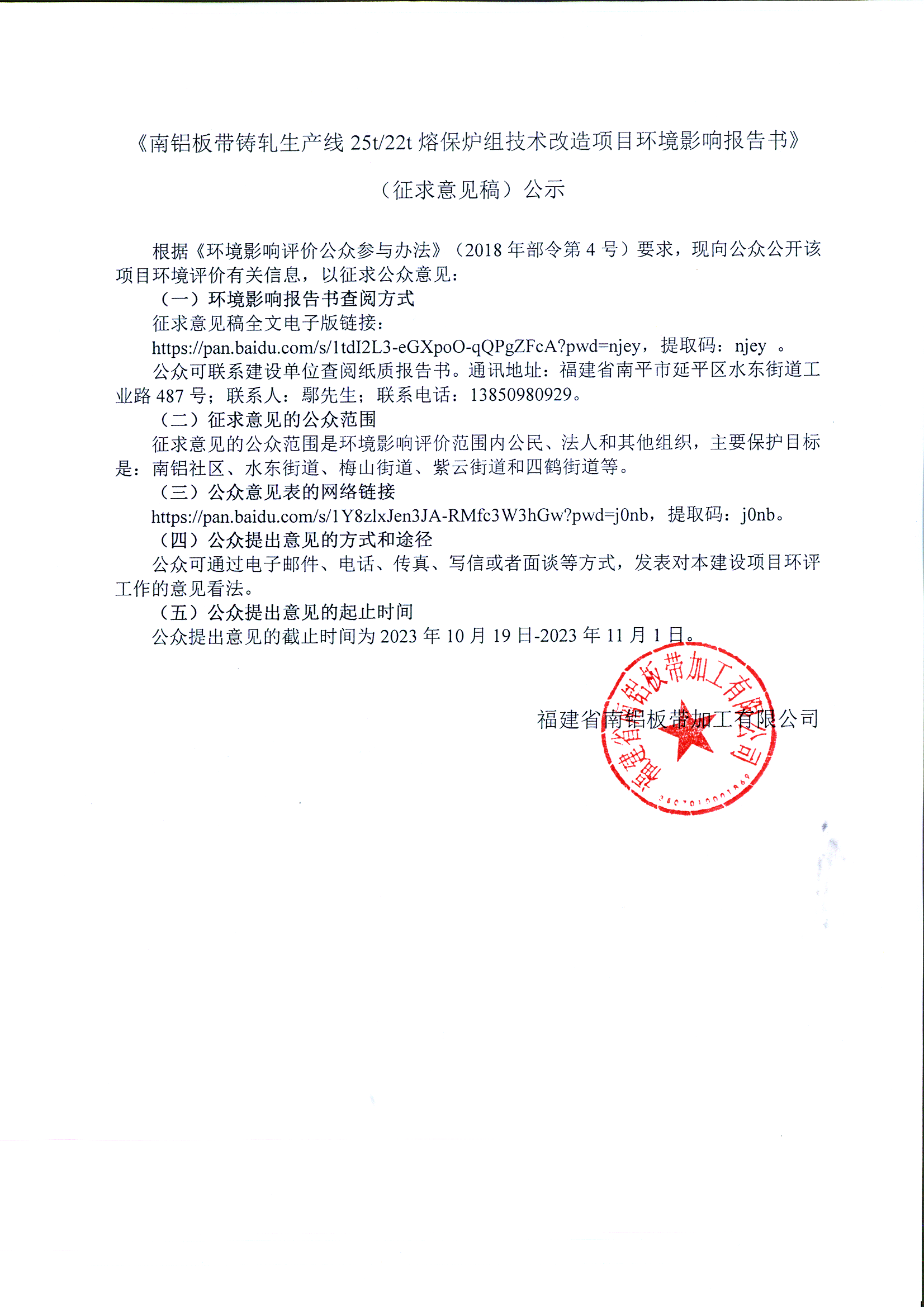 南鋁板帶鑄軋生產(chǎn)線25t、22t熔保爐組技術改造項目環(huán)保設施調試日期公示 |